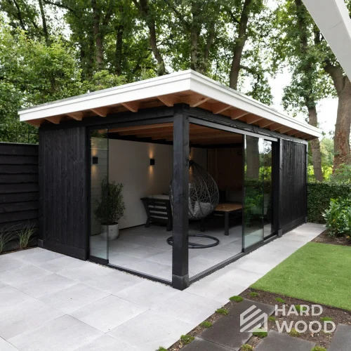 Лофт вырос из индустриальной эстетики: прямые линии, понятный каркас, фактура материалов на первом плане. В беседке это выражается в открытых балках, строгой геометрии, крупном остеклении и функциональности каждой детали. Никакой визуальной «тяжести» — только то, что работает на комфорт и стиль.