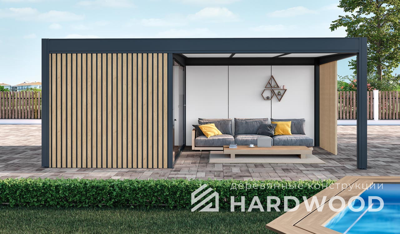 Беседка-лофт — это лаконичная конструкция с акцентом на индустриальный стиль: открытое пространство, металл, дерево, широкие проёмы, минимализм в дизайне и максимум воздуха.